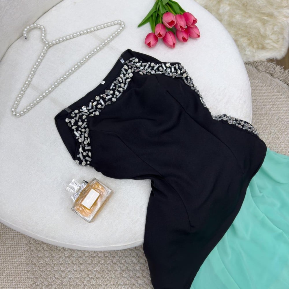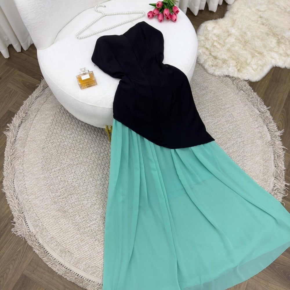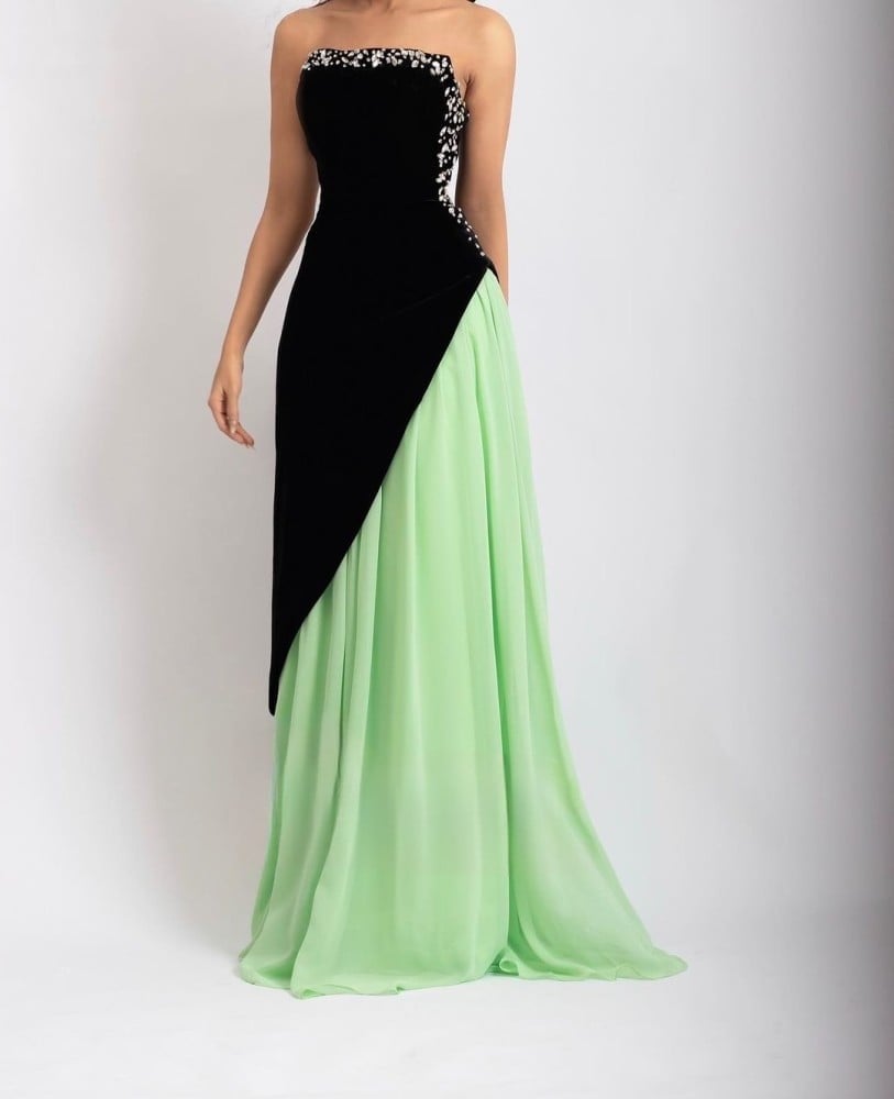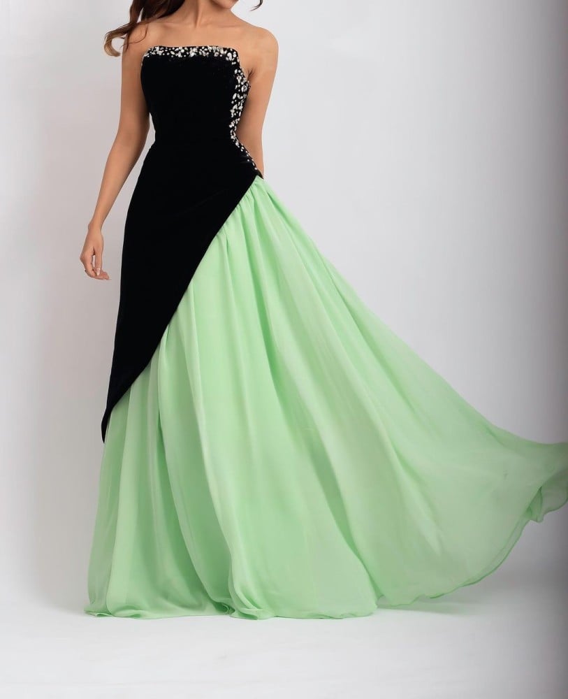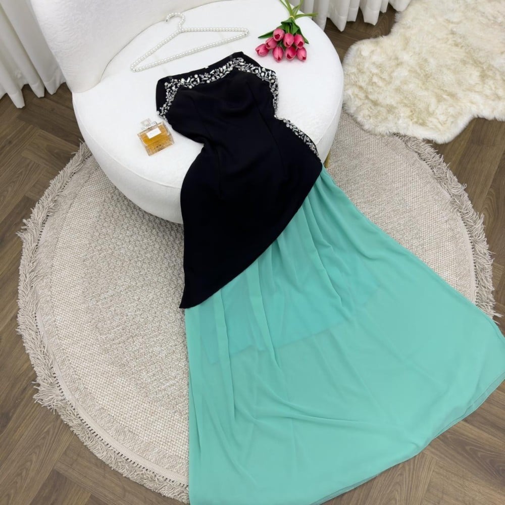 فستان مكسر بتصميم عصري ومميز يجمع بين الأناقة والراحة. يتميز هذا الفستان بتصميمه الفريد الذي يجعله الخيار المثالي لكل من تسعى للتألق. يتميز الفستان بلون أسود داكن يتداخل مع لون أخضر فاتح، مما يخلق تباينًا جذابًا يلفت الأنظار. القماش المستخدم هو قماش خفيف وناعم، مما يمنحك شعورًا بالراحة طوال اليوم.
